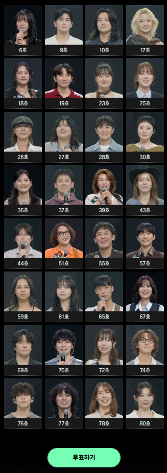JTBC 음악 예능 프로그램 ‘싱어게인4’의 대국민 온라인 투표가 진행 중입니다. 시청자는 매주 방송을 통해 공개된 무대 중 ‘한 번 더 보고 싶은 가수’를 직접 선택하여 프로그램의 결과에 참